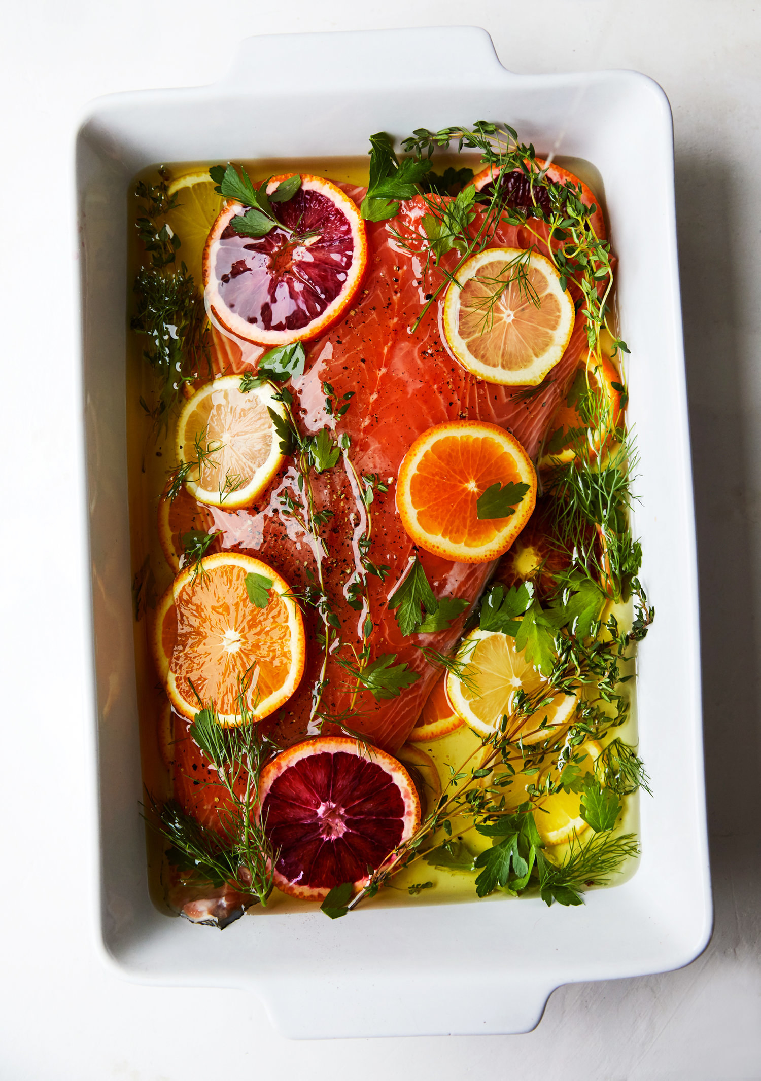 This is one of the most fool-proof — not to mention one of the most beautiful — ways to cook salmon. It roasts low and slow in olive oil, citrus, and herbs.