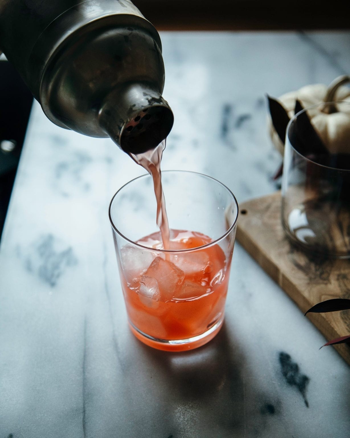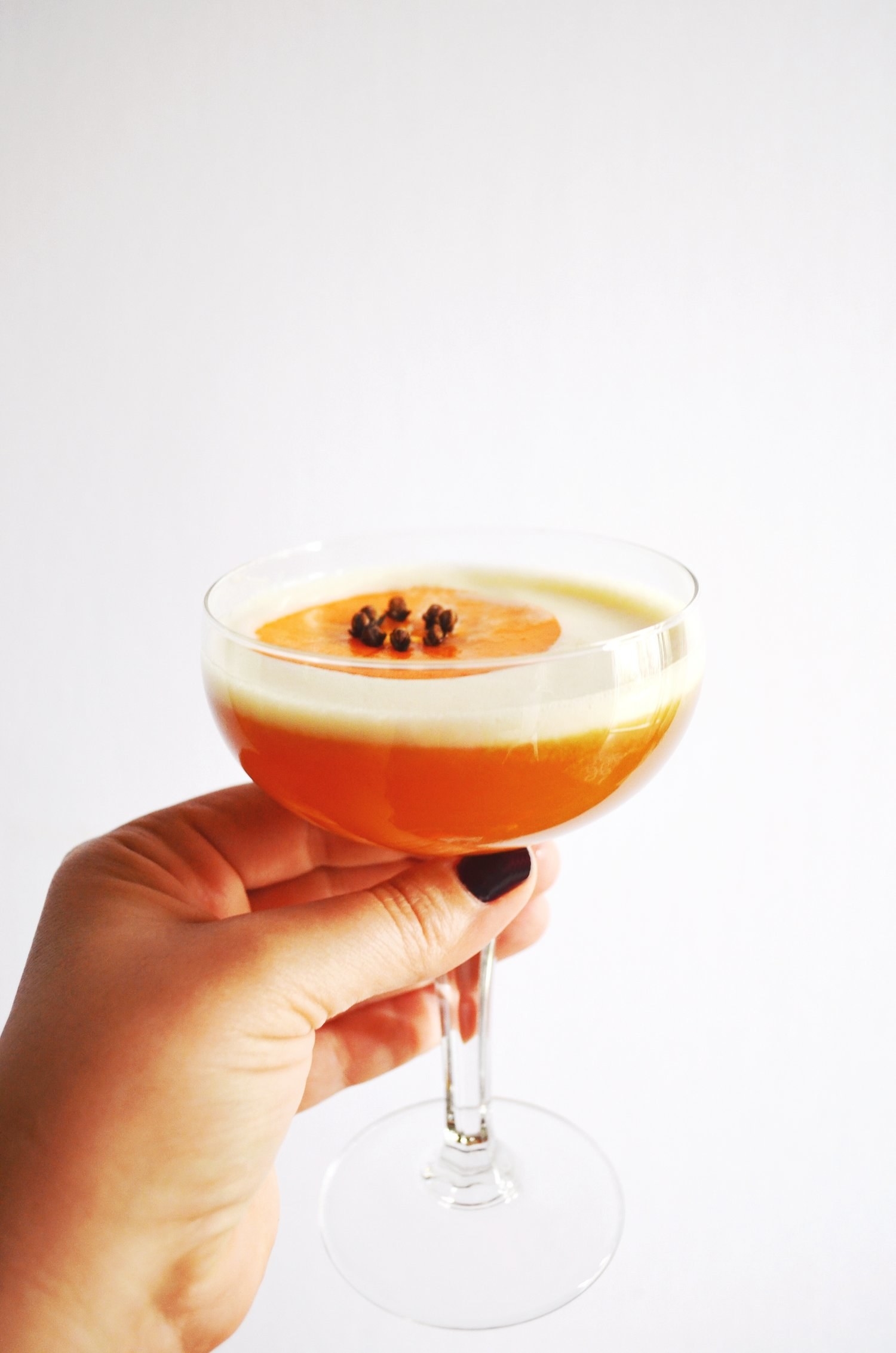 This sophisticated drink will immediately turn your living room into a cocktail bar. It's made with bourbon, amaretto, bitters, fresh citrus juice, persimmon, and an egg white, which creates a rich and foamy top layer.
